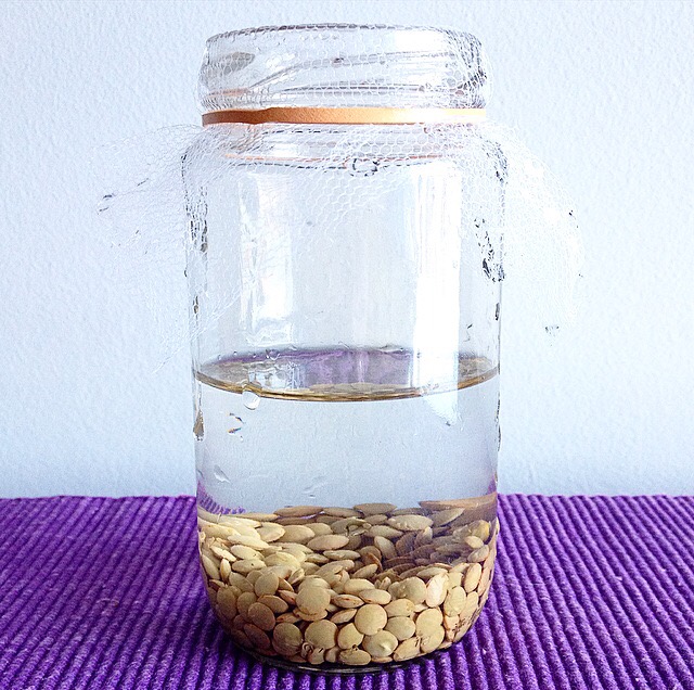 1- Coloque uma colher de sopa (por pessoa) de sementes de lentilhas em um pote de vidro bem limpo, cubra com um filó preso por um elástico.
