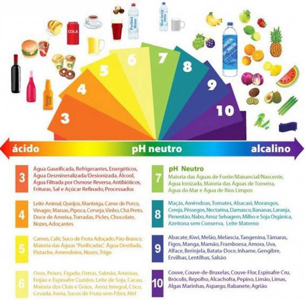 pH 3 (muito ácido): Água com gás, refrigerante, águas com sabores e gás, energético, bebida alcoolica, fritura, sal, açúcar refinado, enlatados, embutidos e cigarro.