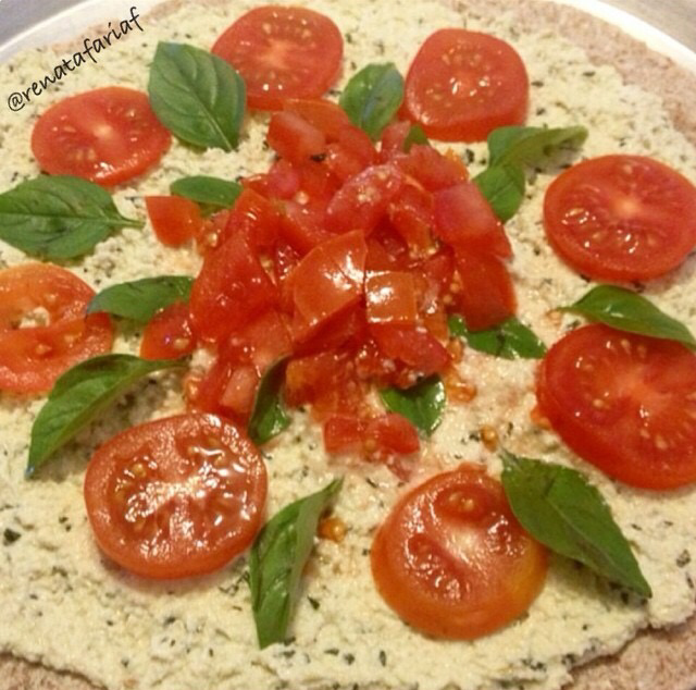 Depois de desidratar a massa, coloque por cima a pasta de girassol, regue com um pouco de azeite e orégano, cubra com os tomates, as folhinhas de manjericão e pronto.
