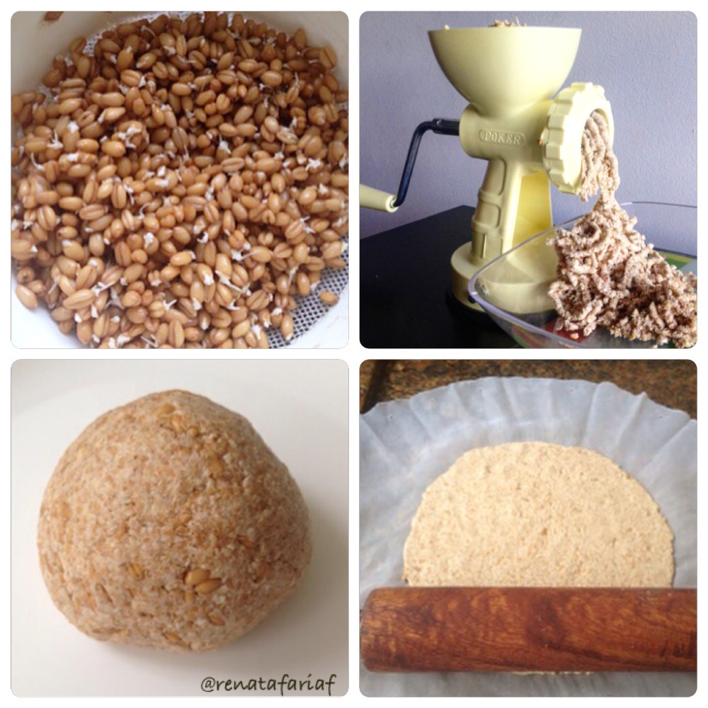 - Massa: 1 e ½ xícara de trigo com 36h de germinação. Lave as sementes e deixe secar bem. Passe no moedor 3 vezes (ou no processador) com sal. Modele a massa com rolo de pastel no formato de pizza e coloque sobre um pano (ou voal). Desidrate no sol ou no forno aberto com temperatura de no máximo 42ºC, onde a mão suporte segurar o tabuleiro. Após 2h, vire para expor a 2ª face ao sol. Repita este procedimento até a desidratação completa.