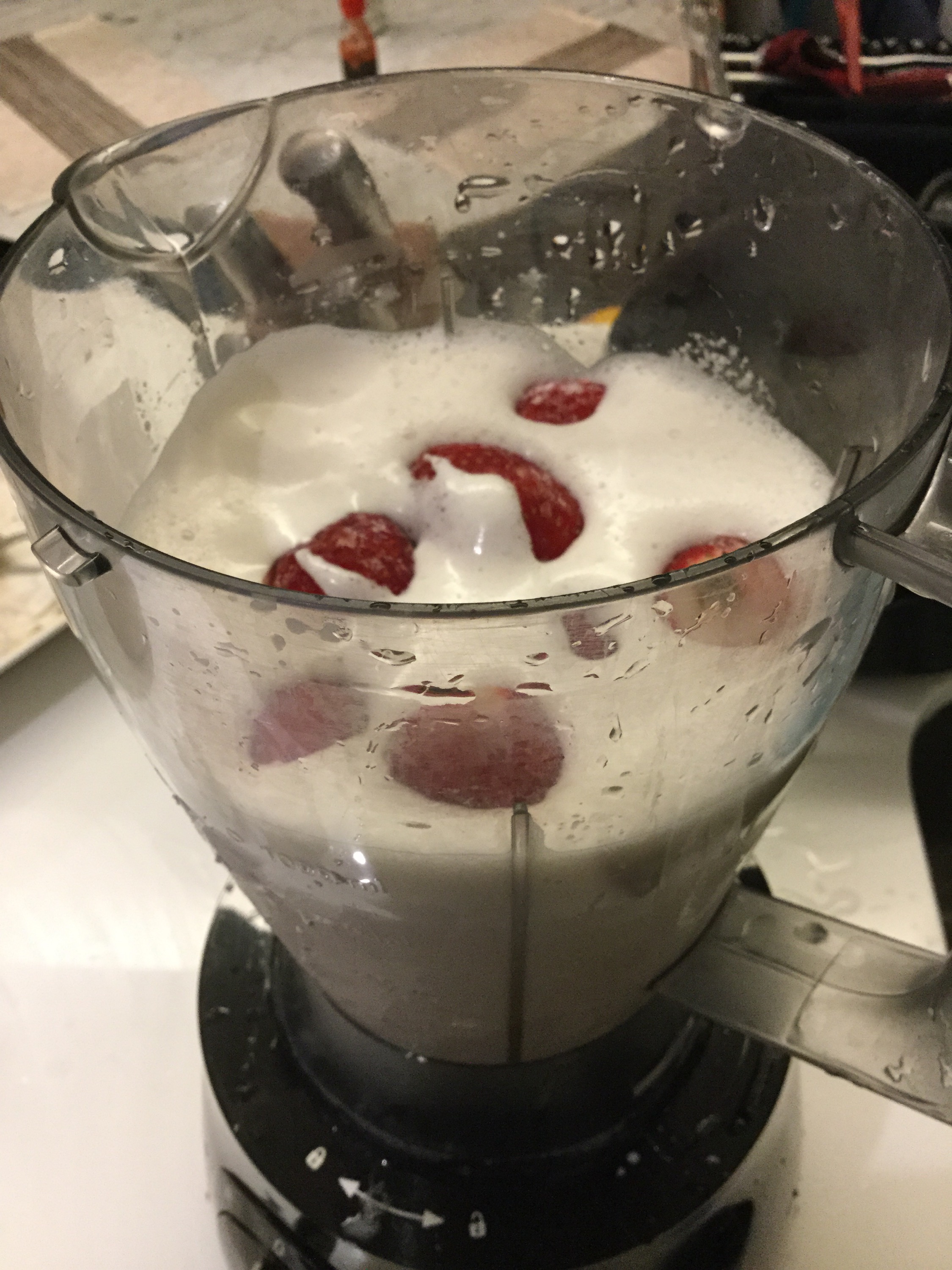 - 100 g de morango ( dê preferência ao orgânico, pois é um dos alimentos que mais contém agrotóxico. Limpe e leve os morangos ao congelador por pelo menos 1 hora. As frutas congeladas são ótimas opções para shakes e smoothies)